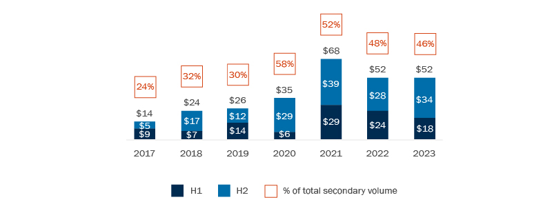 For H2 2023, transaction volume in global GP-led markets climbed 88% compared to the first half of the year, according to Jefferies, with $34 billion of the total $52 billion in deal volume (approximately 65%) estimated to have resulted from transactions closed in the second half of 2023.