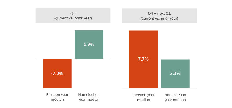 The 2024 U.S. presidential election is approaching quickly, and the M&A community is speculating on its impact on deal activity. Common wisdom among dealmakers is that U.S. presidential elections have more of an effect on deal timing than deal outcomes. Deal volumes in the third quarter of presidential election years are typically depressed relative to non-election years, while relative deal volumes in the first quarter of the year following presidential elections spike by approximately the same amount that they were depressed prior to the election. This “dip and recovery” pattern suggests that some deals are delayed to allow parties to adjust deals for election outcomes—but that most ultimately go through in some form, regardless of the election outcome. See Figure 1.
