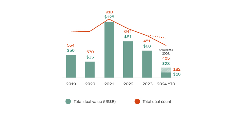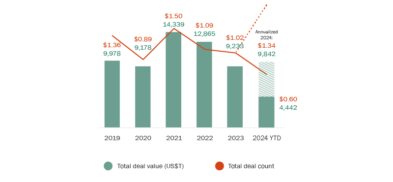 In the first half of 2024, the global M&A market showed signs of recovery from 2023’s troughs, with the global value of M&A activity reaching US$1.0 trillion, which represents a 4% increase compared to the same period last year but remains substantially below a ten-year average of US$1.5 trillion at the end of Q21.