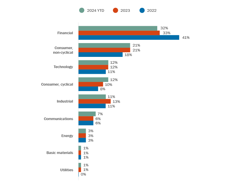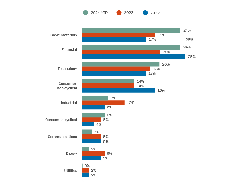 From a sector perspective, the volume of deals in most sectors is consistent with historical averages. Financial services M&A is seeing a spike in overall volume (led by Capital One’s $35 billion acquisition of Discover as well as large deals in the private equity and insurance subsectors). Among the other sectors in which significant deals have transacted so far in 2024 are energy (ConocoPhillips’ $36 billion acquisition of Burlington Resources and Diamondback Energy’s $26 billion acquisition of Endeavor), tech (Synposys’ $35 billion acquisition of Ansys) and basic materials (Home Depot’s $18 billion acquisition of SRS Distribution). See Figure 3.
