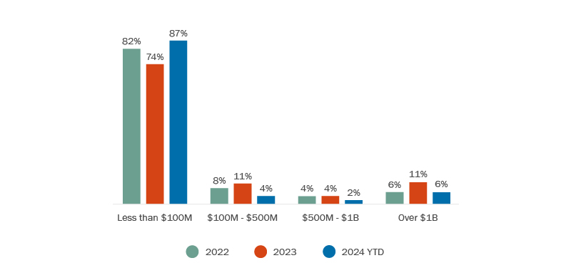 The size of Canadian inbound deals has also continued to decrease. The proportion of southbound deals from Canada into the U.S. with a deal value under $US10 million has increased to 87% from 74% in 2023 and 82% in 2022, while deals in the sub-$500 million, sub-$1 billion and $1 billion+ ranges all remain lower than prior years. See Figure 5.