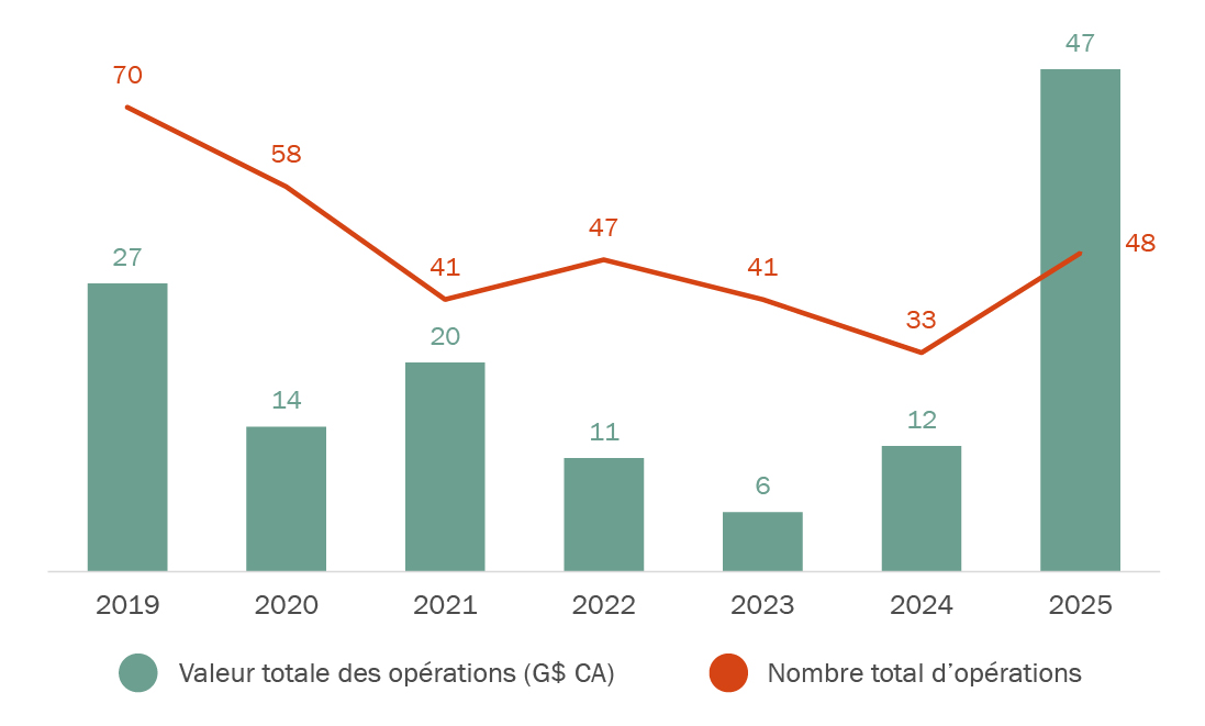 L’année dernière a été une année exceptionnelle pour les fusions et acquisitions dans les secteurs des infrastructures et de l’énergie au Canada, et rien n’indique que cette dynamique ralentira en 2026. Cette vigueur s’explique par plusieurs tendances majeures, notamment des événements géopolitiques qui donnent lieu à des niveaux d’investissement sans précédent; de vastes initiatives gouvernementales visent ainsi à accélérer la réalisation des projets et à soutenir les dépenses en infrastructures. Par ailleurs, les infrastructures numériques, en particulier les centres de données (et l’énorme demande d’énergie qu’ils génèrent) ainsi que les projets liés à la résilience des infrastructures et à la décarbonation continuent d’attirer des volumes considérables de capitaux. Nous présentons ici les résultats de 2025 en matière de fusions et acquisitions pour le secteur de même que les tendances qui façonneront l’année à venir pour les négociateurs.