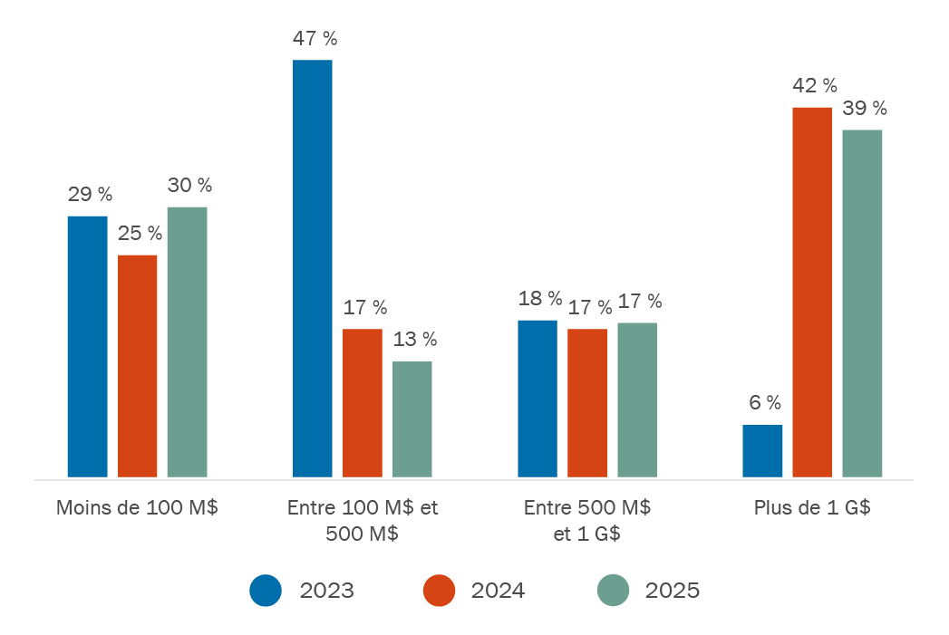 Les activités de fusion et acquisition dans les secteurs des infrastructures et de l’énergie au Canada ont atteint des sommets inégalés, le nombre d’opérations étant passé de 33 en 2024 à 48 en 2025 (voir la figure 1), une augmentation de 45 %. La valeur des opérations a également bondi pour atteindre 47 milliards de dollars en 2025, soit près de quatre fois le total de 2024 (12 milliards de dollars), et près de 40 % des opérations réalisées en 2025 dans les projets d’infrastructure et d’énergie ont dépassé le seuil du milliard de dollars (voir la figure 2). Plusieurs opérations de grande valeur ont contribué de façon significative à ce résultat, notamment la vente de Neoen à Brookfield et à Temasek pour 6,6 milliards de dollars1.