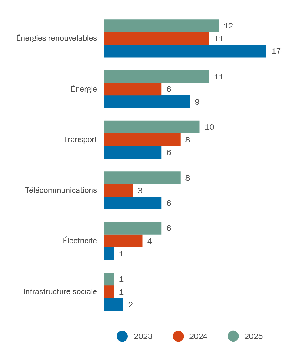 En 2025, la forte progression des activités de fusion et acquisition s’est répartie de manière relativement équilibrée entre les secteurs des énergies renouvelables, de l’énergie et des transports, suivis de près par les télécommunications et l’électricité; le secteur des infrastructures sociales est demeuré relativement stable d’une année à l’autre (voir la figure 3). Nous prévoyons une hausse marquée des investissements dans les infrastructures numériques et les centres de données, des fusions et acquisitions dans le secteur de la défense ainsi que de l’activité dans les secteurs de l’électricité et des énergies renouvelables. L’année 2026 s’annonce très prometteuse pour ces secteurs phares.