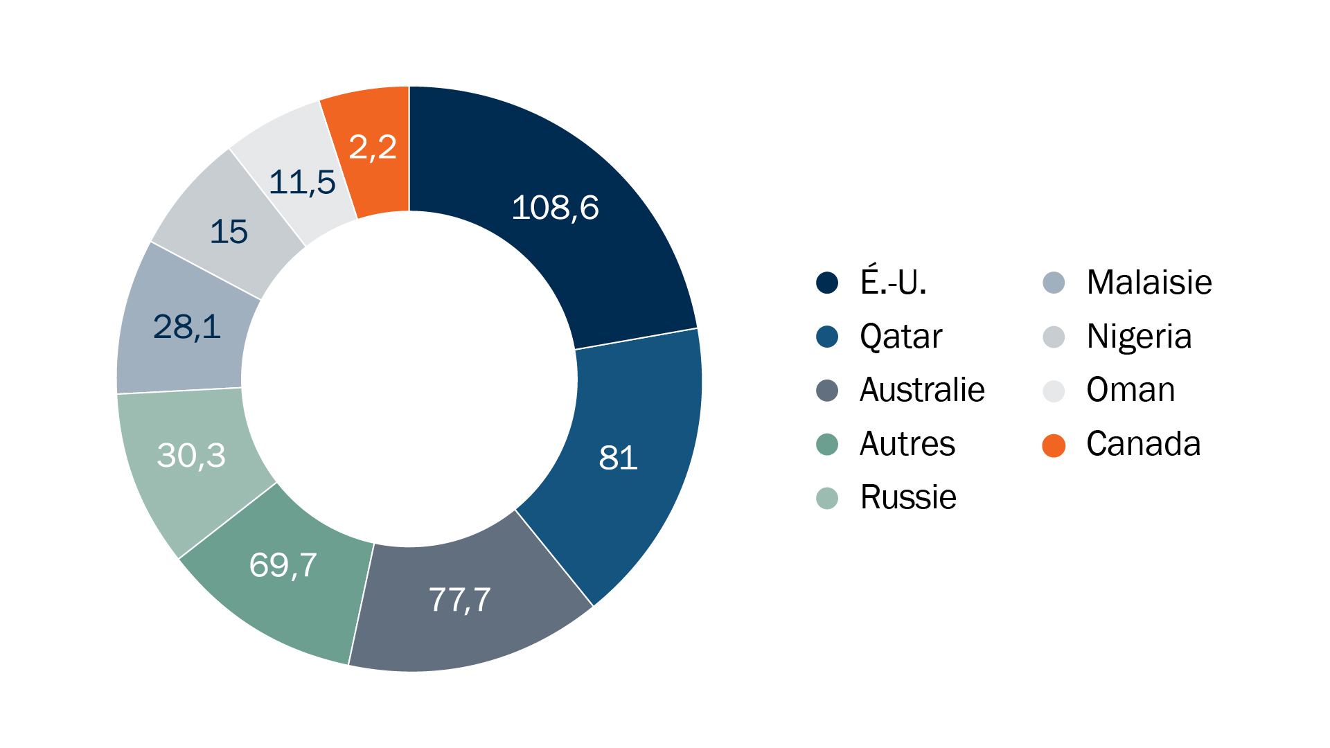 Le Canada est en bonne position pour devenir l’un des principaux fournisseurs mondiaux de GNL, car la demande pour des sources de gaz naturel fiables s’intensifie dans le monde entier. Le Canada est le cinquième producteur mondial de gaz naturel, mais s’est classé au 19e rang des 24 pays exportateurs de GNL en 20251. Cette situation est appelée à changer avec l’augmentation de la production canadienne de GNL au cours des prochaines années. Bon nombre de pays cherchent à diversifier leur approvisionnement en GNL, ce qui rend l’offre canadienne, sûre et stable à long terme, de plus en plus attrayante.